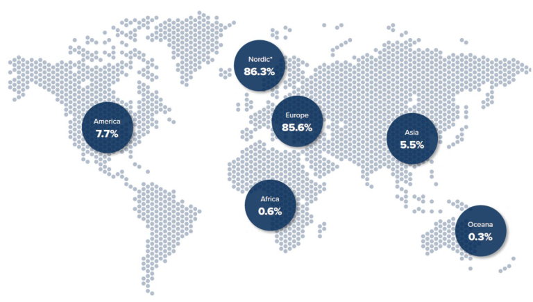 Jotron sourced products and services to core business activities from 323 suppliers exceeding NOK 100 000 per supplier in 2024. These suppliers were spread across 24 countries. The majority of products and services, in term of purchase costs, were sourced from suppliers in Europe (85.6%). The Nordics make up 86.3% of the European purchases.